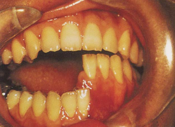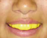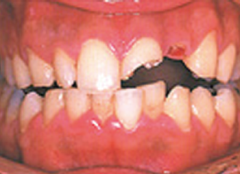 歯ぎしりや強い噛みしめにより、対合歯と接触する歯の切縁や咬合面の歯質が擦り減った状態です。 一般に前歯の先端や奥歯の噛み合わせ面に現れ、1~2本という少数に生じるよりは、歯全体あるいは左右片側全体の歯に生じることが多く見られます。 咬耗した面は平滑で、磨いたようになっていることが多く、歯がしみることもあります。 象牙質まで進行すると次第に褐色のくぼみができ、噛み合わせ全体が低くなった場合には、競技パフォーマンスが低下することもあります。