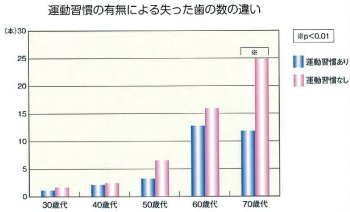 運動をする習慣のある人とない人では、運動習慣のある人のほうが自分の歯が多く残っているということがわかっています。さらに歯がない人は歯がある人に比べ1.1〜2.7倍死亡のリスクが高くなることもわかっています。残っている歯の本数や歯周病などの口の病気と体の健康とは関係ないと思われがちですが、大いに関係があります。たとえば、残っている歯の数と寿命の関係や、認知症との関係、メタボリックシンドロ一厶と歯周病の関係などがわかっています。継続的に自分の歯や歯肉をケアして、自分の歯でしつかりと嚙むことは生涯健康で生きるためにとても大切です。